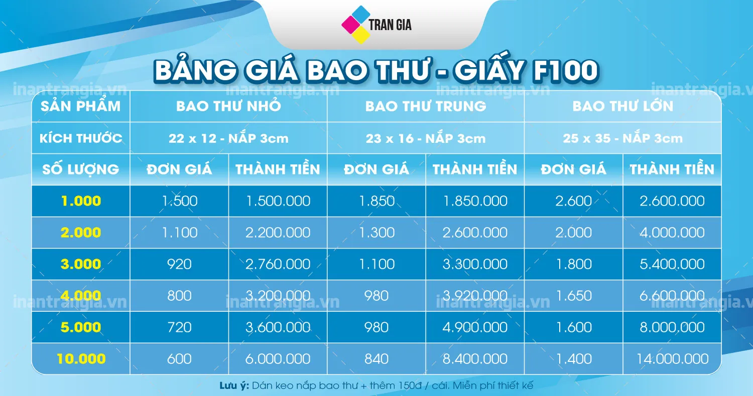 Để giúp quý khách dễ dàng dự trù chi phí, In Ấn Trần Gia xin gửi đến bảng báo giá tham khảo. Giá in bao thư phụ thuộc vào Kích thước - Chất liệu - Số lượng. In càng nhiều, giá trên mỗi sản phẩm càng rẻ!