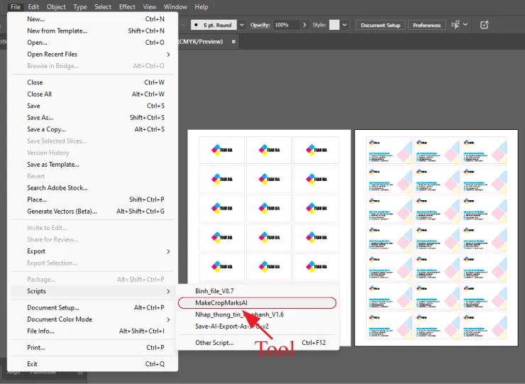 - Bước 4: Chạy Script và Tùy Chỉnh Vào File > Scripts > MakeCropMarksAI (nếu đã cài) hoặc File > Scripts > Other Script... (nếu chưa cài).